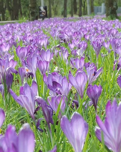 Skoro kvitnúca zmes veľkokvetých holandských krokusov v žltej, modrej, bielej a fialovej farbe.