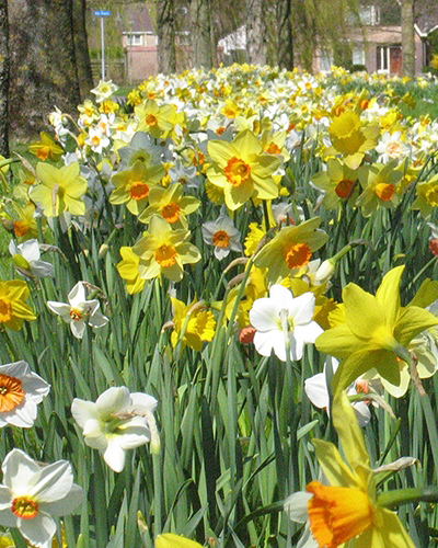 Vyvážená zmes mnohých druhov veľkokvetých narcisov v rôznych formách, farbách a tvaroch.