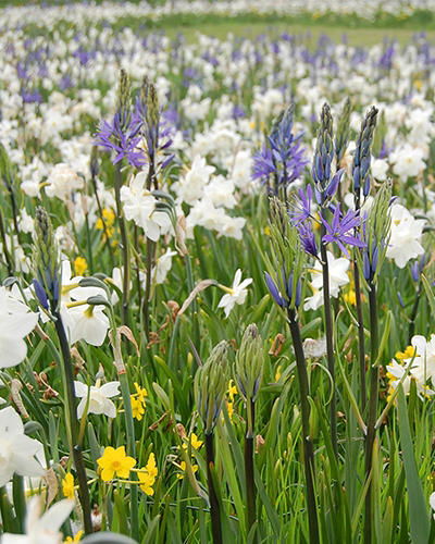 Tri rôzne farby v jednej zmesi. Žlté narcisy začínajú show v marci, nasledujú biele narcisy a končia kamasie v rôznych odtieňoch modrej.