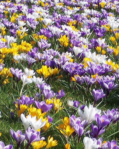 Skoro kvitnúca zmes veľkokvetých holandských krokusov v žltej, modrej, bielej a fialovej farbe.