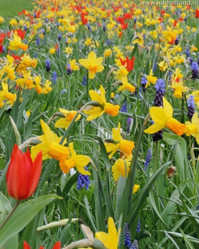 Táto zmes je prekvapivou kombináciou skorých krokusov, po ktorých nasledujú botanické narcisy, modrice a jasne červené tulipány.