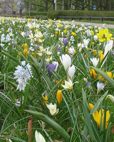 Zmes so širokou škálou druhov cibúľ pre dlhé obdobie kvitnutia. Krokusy, chionodoxy, botanické narcisy, puškinie a tulipány.