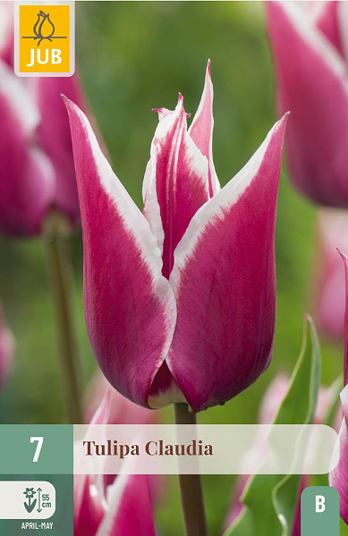 Nádherný fialovo-biely tulipán kvitnúci ako ľalia. Pútavý doplnok do záhrady. Nápadný, elegantný záhradný tulipán, vhodný aj do kvetináča na terasu alebo balkón. Pekne sa kombinuje s inými ľaliokvetými tulipánmi.