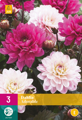Veľkokvetá, dekoratívna DÁLIA mix Adorable kvitne celé leto od júla až do mrazov. DÁLIA Adorable raste do výšky cca 90-100 cm. Niekedy je potrebné poskytnúť stonkám oporu. Dáliové hľuzy sa sadia na jar. DÁLIA Adorable je citlivá na nočný mráz. Vykopte priestrannú jamku, pôdu v jame dobre skyprite a vyplňte kvalitným substrátom. Hľuzy opatrne vložte do jamky a zahrňte substrátom vo vrstve 3-5 cm. Vzdialenosť medzi hľúzkami je 30-60 cm. Hľuzy po vysadení polejte. DÁLIA kvitne najlepšie na plnom slnku. Hľuzy po odkvitnutí skladujte na mieste kde nemrzne a budete si ich užívať dlhé roky. DÁLIA Adorable sa dobre hodí k trvalkám a ostatným odrodám dálií. Kvety sú veľmi atraktívne v záhonoch. DÁLIA Adorable je tež vynikajúcim kvetom k rezu a má dlhú životnosť vo váze. Najlepší čas na rez dálií je skoro ráno. Zrezané kvety dajte ihneď do vlažnej vody.