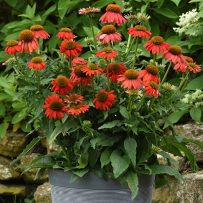 Prvá F1 hybridná echinacea v samostatnej farbe. Vytvára konzistentné, dobre rozvetvené, plné a uniformné rastliny. Rovnomerné kvitnutie zabezpečuje, že sú rastliny prirpavené na predaj v rovnakom čase. Kvety sa otvárajú v červenej farbe a postupne sa farba mení a slabne.