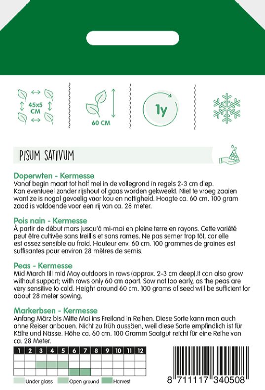 Vysievajte nie príliš skoro, pretože hrášok je veľmi citlivý na chlad. Výška okolo 60 cm.