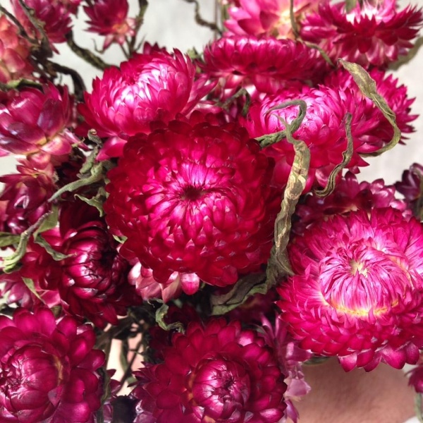 Helichrysums sú jedny z najznámejších sušených kvetov. Sú tiež známe ako Helichrysum bracteatum, večný kvet alebo slamienky. Pochádzajú z rovnakej čeľade kvetov ako slnečnice. Farebná škála je krásna od bielej a ružovej až po žltú, červenú, oranžovú a lososovú. Tieto prírodné biele kvety sa predávajú voľne ložené a dajú sa použiť na širokú škálu dekorácií a vďaka svojej dlhotrvajúcej farbe by sa dali použiť na kvetinové steny alebo veľké akcie a výstavy. Veľkosť hlavy je 3-4 cm v priemere