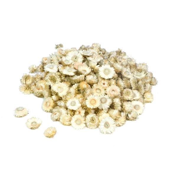 Helichrysums sú jedny z najznámejších sušených kvetov. Sú tiež známe ako Helichrysum bracteatum, večný kvet alebo slamienky. Pochádzajú z rovnakej čeľade kvetov ako slnečnice. Farebná škála je krásna od bielej a ružovej až po žltú, červenú, oranžovú a lososovú. Tieto prírodné biele kvety sa predávajú voľne ložené a dajú sa použiť na širokú škálu dekorácií a vďaka svojej dlhotrvajúcej farbe by sa dali použiť na kvetinové steny alebo veľké akcie a výstavy. Veľkosť hlavy je 3-4 cm v priemere