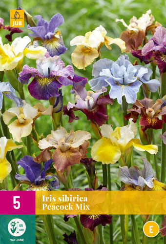 Flowers of the Iris sibirica Peacock Mix have a nice shape and have various beautiful colours. Iris sibirica come in beautiful varieties. The upright petals often have a different color than the drooping petals. This gives a nice color contrast within one flower. Iris sibirica is a hardy Trvalka and grows well in the garden. The plant has thick rhizomes. These thick roots should be planted shallowly and almost horizontally as soon as possible after receipt. First loosen the soil well. Improve heavy garden soil by mixing in sharp sand. Make a mound in the planting hole. Place the thick rhizomes of the irises about 1 cm below ground level on the mound. Fill the planting hole with soil and press firmly. Water immediately after planting. The planting distance is approx. 25-30 cm. These irises grow and flower well in Plné slnko or Polotieň in well-drained, fairly dry soil. The sword-shaped, gray-green leaves die off at the end of summer, but new leaves appear in the fall. In winter, cover the plants with a layer of fallen leaves or some branches. Cut off all the leaves in the spring. Soon new shoots will appear above the ground.
