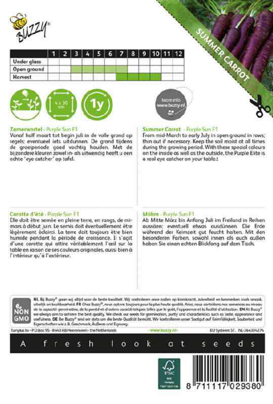 Letná mrkva -Purple Elite F1. Výsev od polovice marca do začiatku júla na otvorenom priestranstve v radoch; možno preriediť. Počas vegetačného obdobia udržiavajte pôdu vlhkú. So špeciálnymi farbami zvnútra aj zvonku máte na stole skutočný pútač.