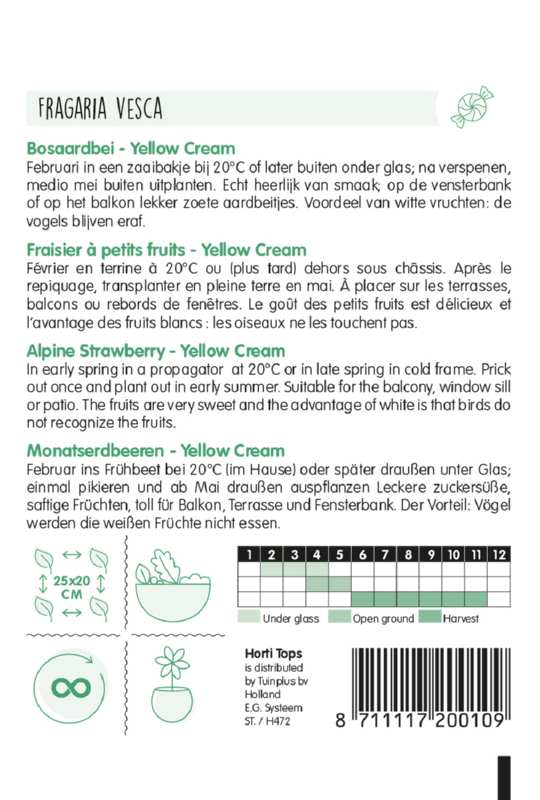 Výsev vo februári do výsevného substrátu na semená pri teplote 20 °C alebo neskôr von pod sklom; po vypichnutí vysádzajte v polovici mája. Naozaj lahodná chuť; sladké jahody na parapete alebo na balkóne. Výhoda bielych plodov: vtáky sa im vyhýbajú.