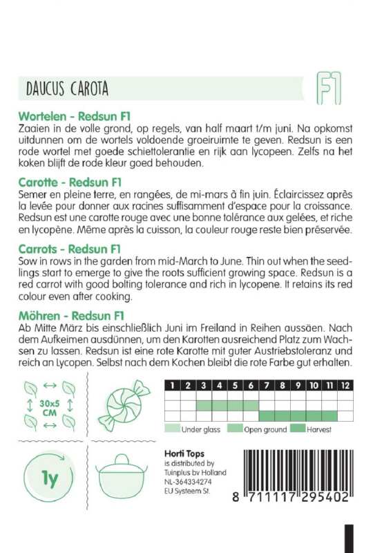 Vysievajte na otvorenom priestranstve, do riadkov, od polovice marca do júna. Po vzídení prerieďte, aby mali korene dostatočný priestor na rast. Redsun je červená mrkva s dobrou znášanlivosťou a bohatá na lykopén. Aj po uvarení je červená farba dobre zachovaná.