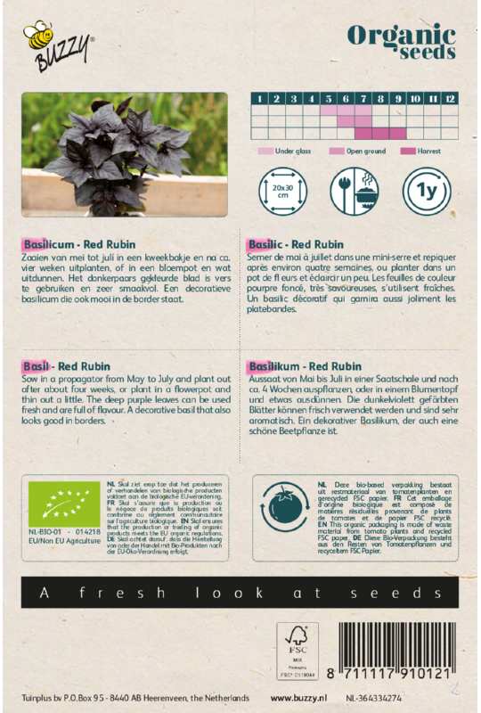 Vysievajte od mája do júla dovýsevného substrátu a po štyroch týždňoch vysaďte von alebo do kvetináča a trochu preriedte. Tmavofialové listy sa dajú použiť čerstvé a sú veľmi chutné. Dekoratívna bazalka, ktorá vyzerá skvele aj v bordúre.