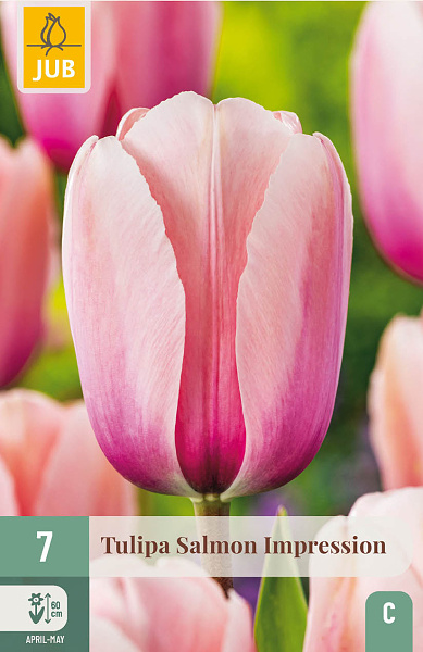 Majestátny, klasický lososovo sfarbený hybridný tulipán s hodvábnym leskom. Obrovské kvety. Pôsobivé. Najlepšie vynikne ako skupina v záhone, ale vhodný aj do kvetináča na terasu alebo balkón.