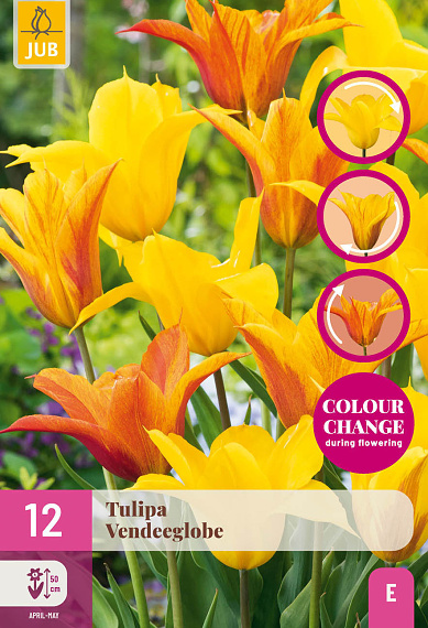 Výrazný žltý až oranžovočervený tulipán. Pútavý doplnok do záhrady. Nádherný pôvabný záhradný tulipán, vhodný aj do kvetináča na terasu alebo balkón. Pekne sa kombinuje s inými ľalioketými tulipánmi.