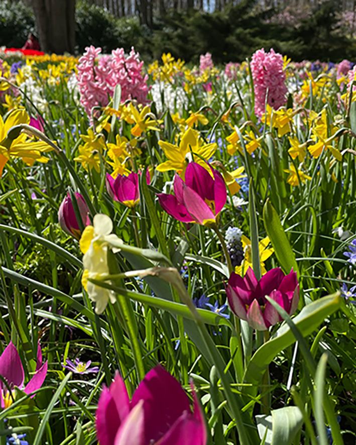 Voňavá zmes s hyacintmi, veternicami, modricami, chionodoxami a rôznymi botanickými tulipánmi a narcismi.