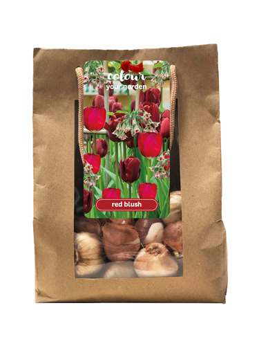 Vrecko so zmesou 25 tulipánov a cesnakov v červenej farbe, vhodné do záhonu, ale aj do kvetináča na terasu alebo balkón. Tieto cibuľoviny sa dajú vysadiť spolu.