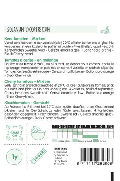 Balenie obsahuje semená 4 odrôd, jednotlivo zabalených: červené cherry paradajky Sweetie, žlté Cereza amarilla, oranžové Bottondoro a čierne Black Cherry.