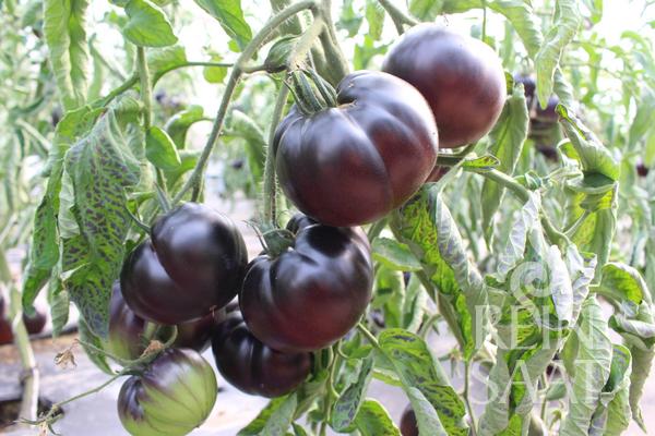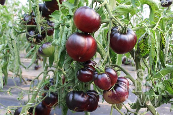 Táto skorá, indeterminantná odroda je skutočným pútačom pozornosti vďaka svojej výraznej modročiernej šupke a kontrastnej červenej dužine.