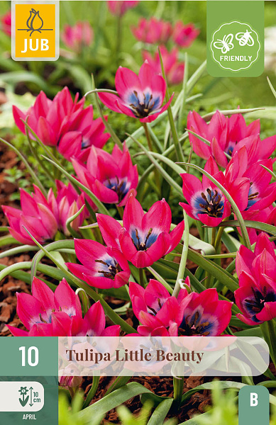 Krásny malý botanický tulipán; ružovočervený s modro-bielym srdcom. Listy sú sivozelené a ležia na zemi. Krásny v záhone, ale aj v kvetináči na terase alebo balkóne. Vhodný na naturalizáciu.