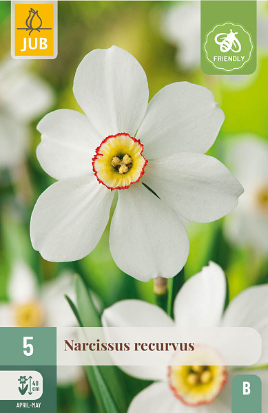 Krásny, decentný narcis (Narcissus recurvus) má biele okvetné lístky a veľmi malý žltý kalich s oranžovým okrajom. Tento narcis vyzerá najlepšie medzi trvalkami. Vyzerá dobre aj v tráve. Majte na pamäti, že túto časť je možné neskôr až pokosiť. Narcis recurvus sa dá vysadiť aj do kvetináčov na terasu alebo balkón. Veľmi vhodný na naturalizáciu. Voňavý.